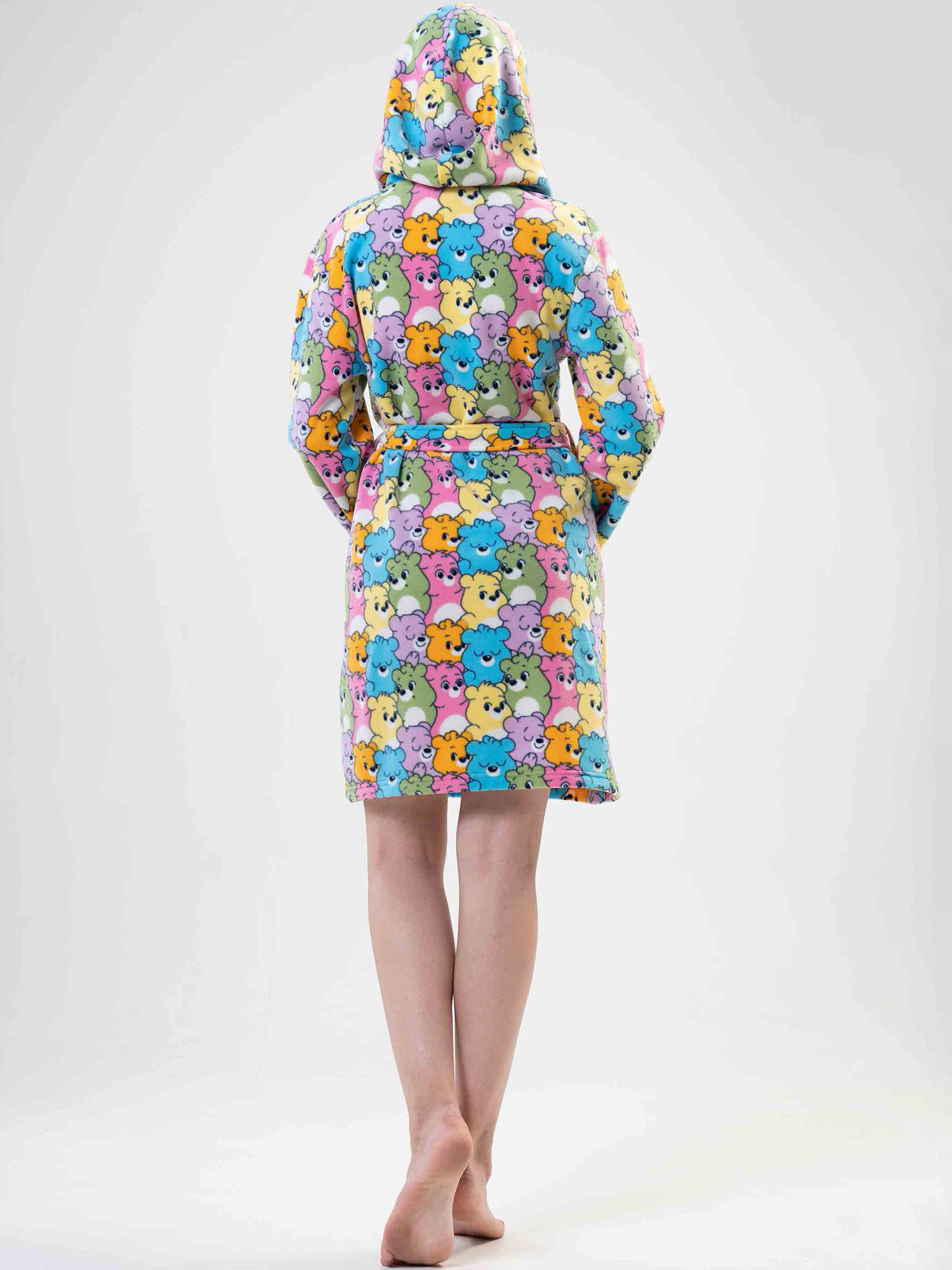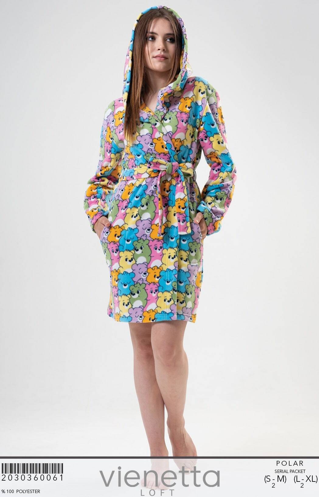 Халат короткий, выше колен. Длинный рукав. Модель на запах, под пояс. Удобный капюшон - непременный атрибут теплого халата. По бокам - удобные практичные карманы.