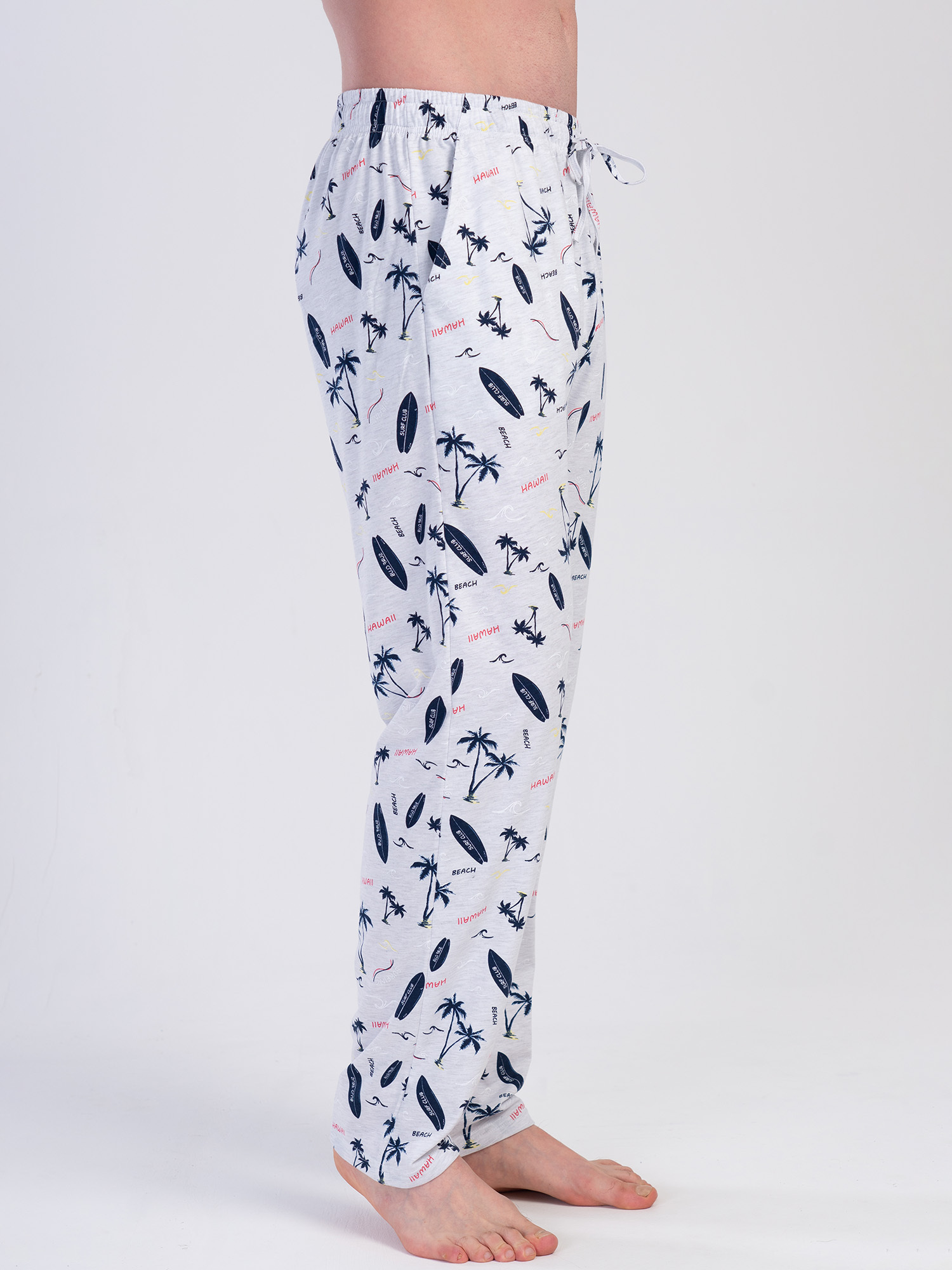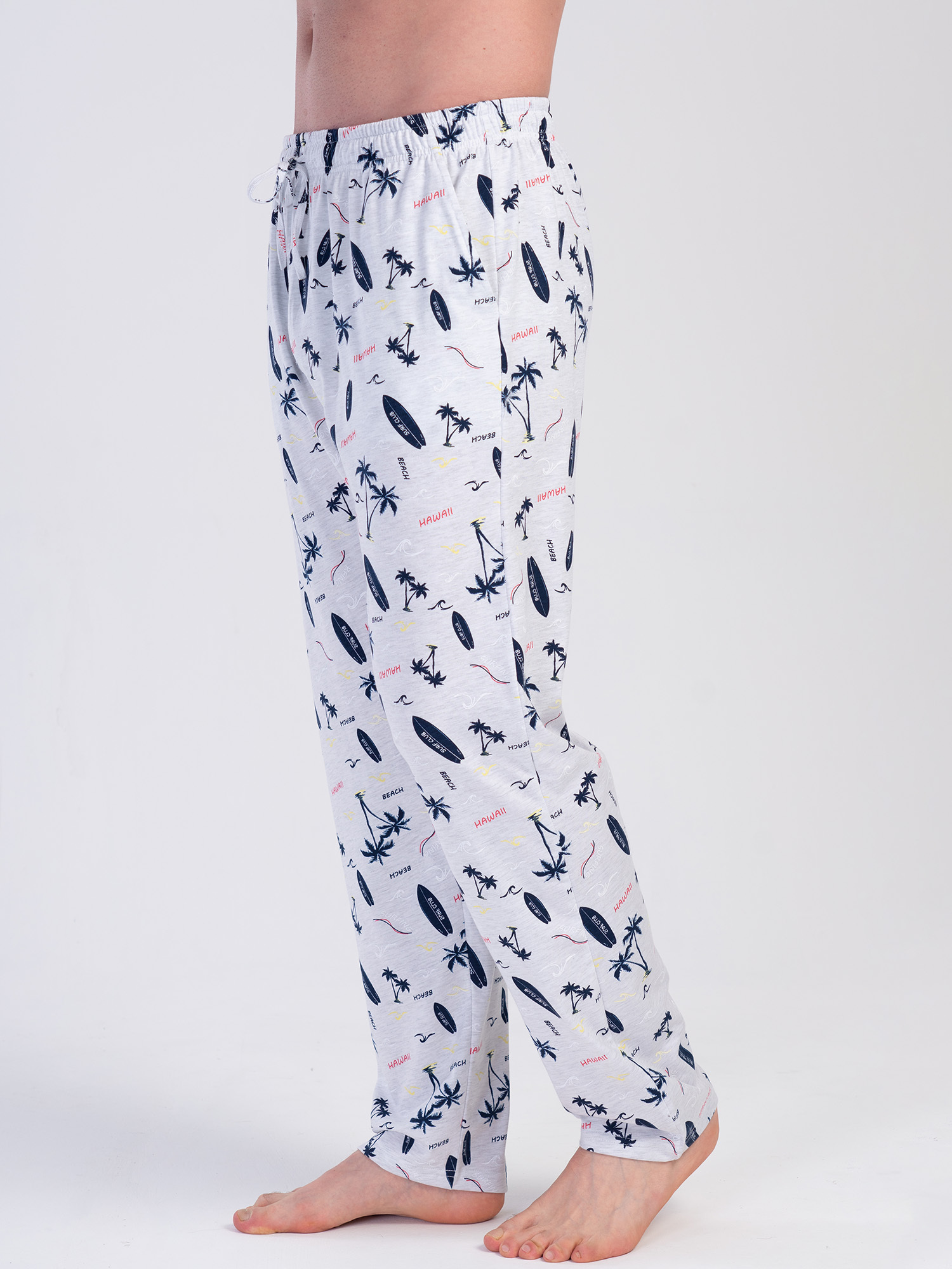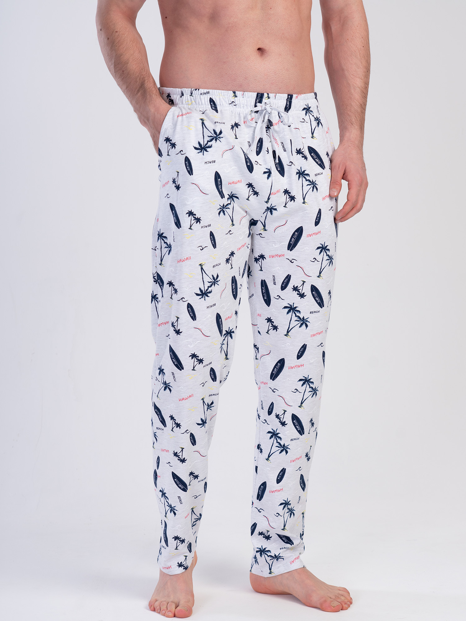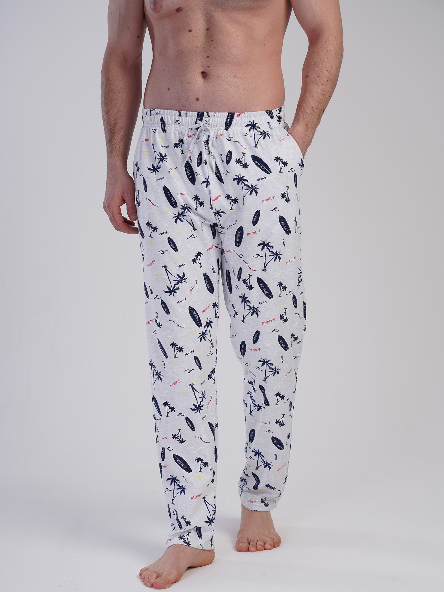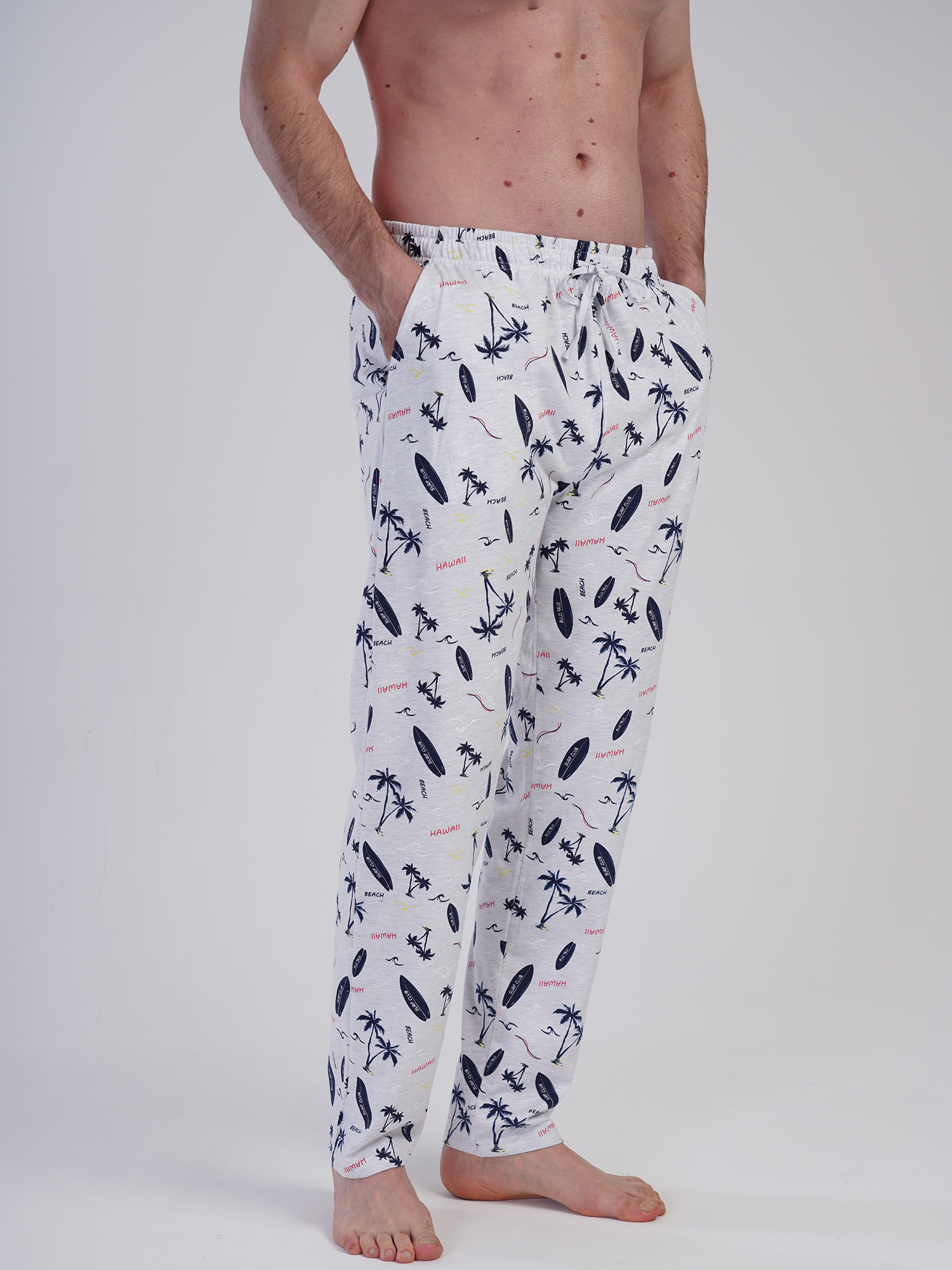 Светло-серый цвет дополнен контрастным принтом в морской тематике – пальмы, сёрфы, волны и надписи Hawaii, создающие лёгкое настроение отдыха. Модель оснащена карманами, что делает её ещё более практичной.