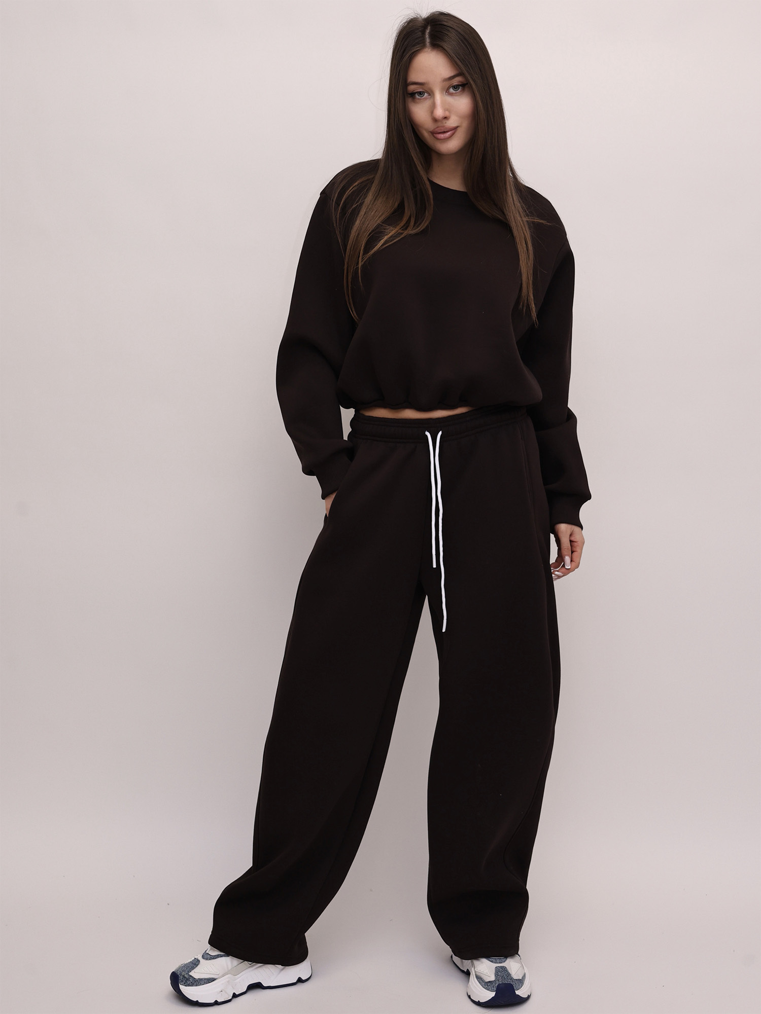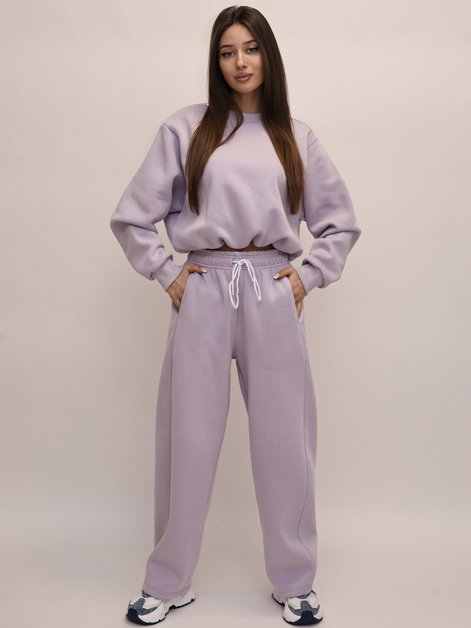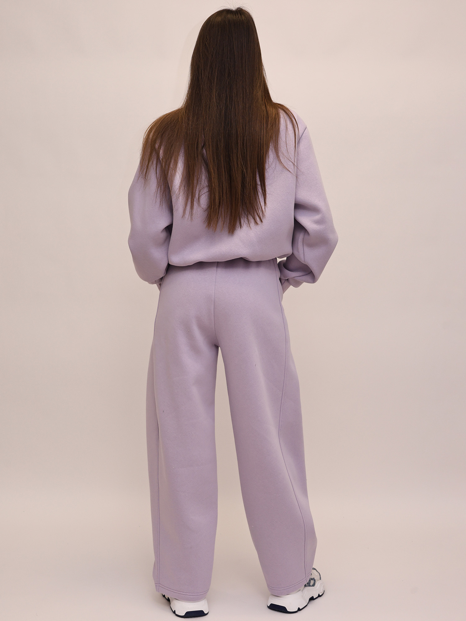 В комплект входят свитшот и широкие брюки. Свитшот отличается оригинальным дизайном: передняя часть слегка укорочена и аккуратно присобрана, за счёт чего модель выглядит интересно и современно. Длинные рукава дополнены манжетами, обеспечивающими удобную посадку.