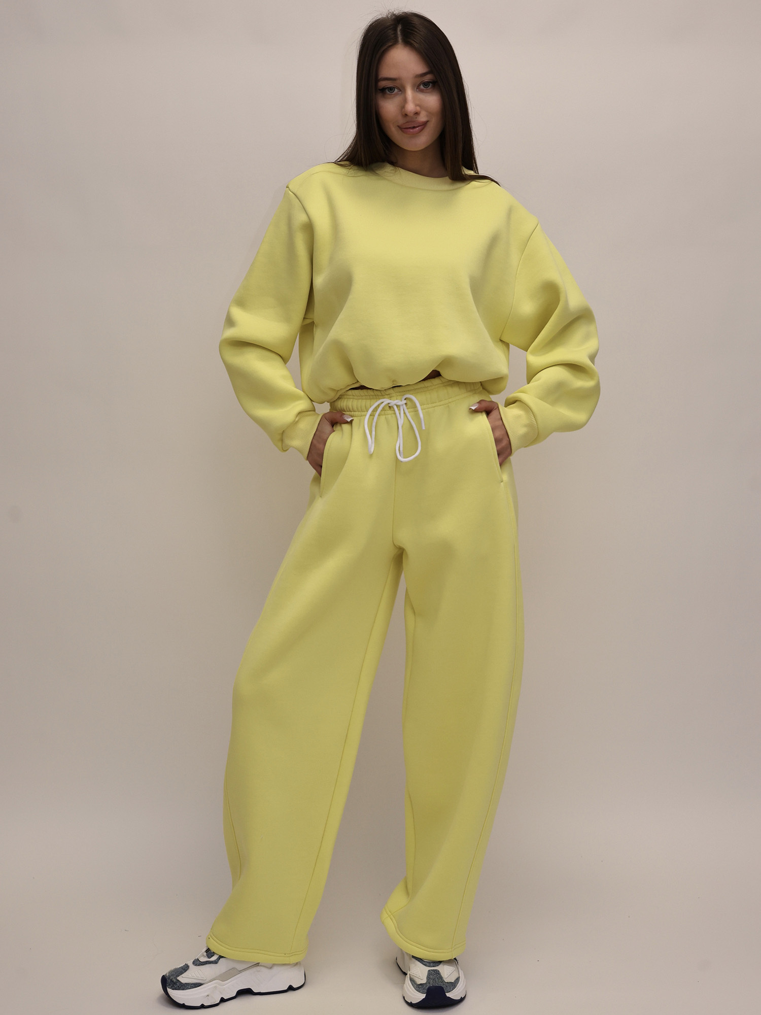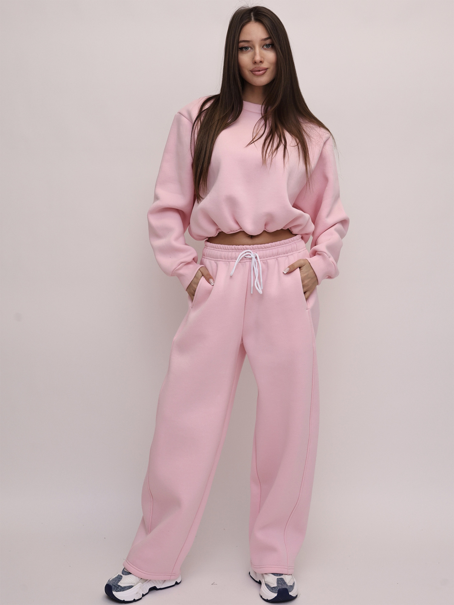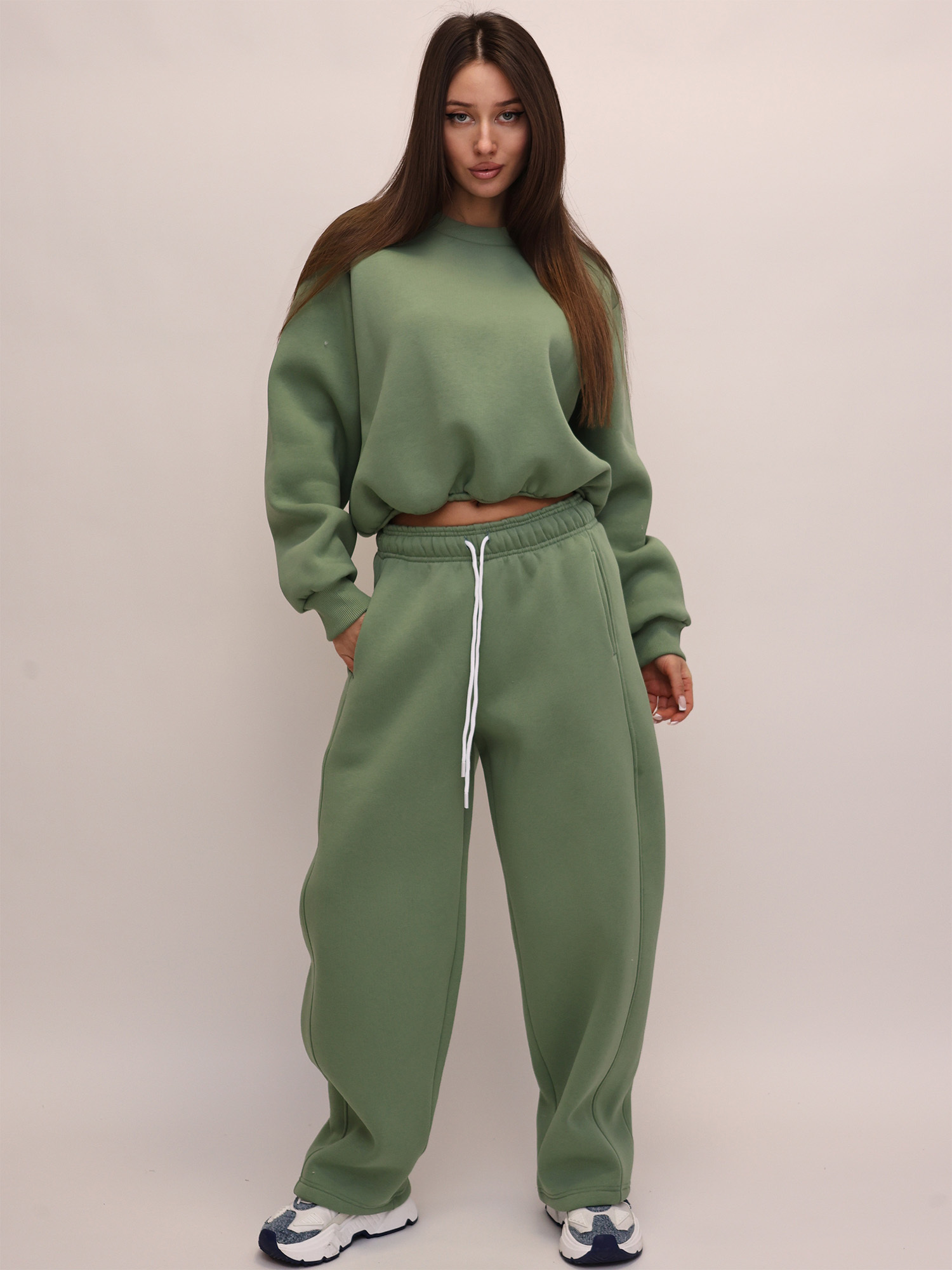 В комплект входят свитшот и широкие брюки. Свитшот отличается оригинальным дизайном: передняя часть слегка укорочена и аккуратно присобрана, за счёт чего модель выглядит интересно и современно. Длинные рукава дополнены манжетами, обеспечивающими удобную посадку.